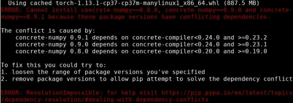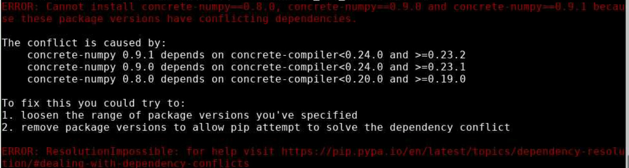 ERROR: Cannot install concrete-numpy==0.8.0, concrete-numpy==0.9.0 and concrete-numpy==0.9.1 because these package versions have conflicting dependencies.