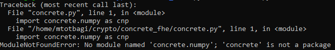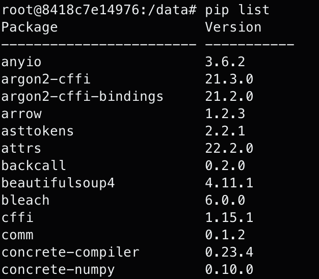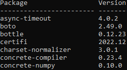 Could you please list the Python’s installed packages in your current environment and make sure concrete-numpy is present. It should output something like: