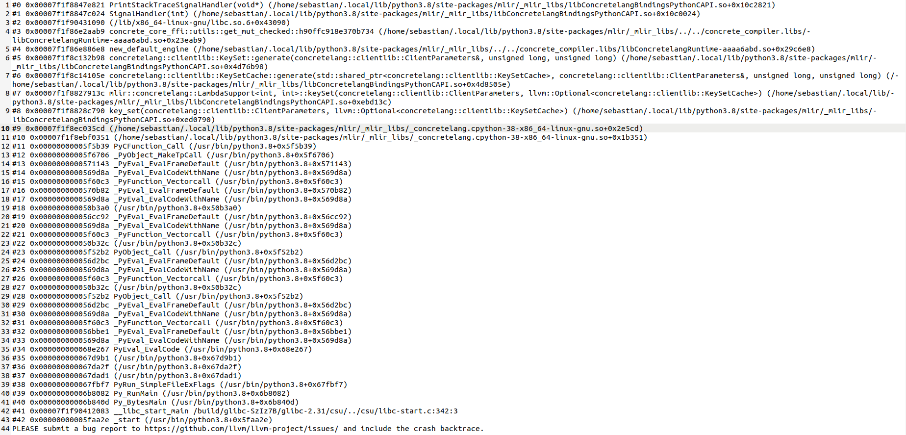 To confirm it’s happening during keygen, could you run your script interactively, but instead of encrypt_run_decrypt, just run circuit.keygen()? Your interpreter should fail during this call