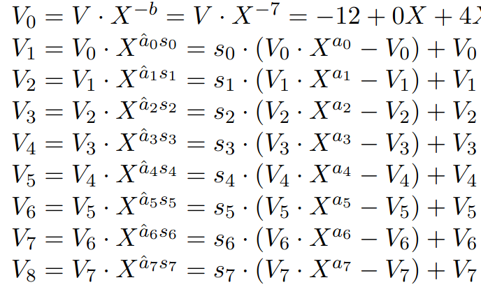 - V(X) * X^{-14} = -6 - 6X + 0X^2 + 0X^3 + 2X^4 2X^5 + 4X^6 + 4X^7