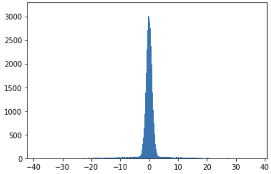 This kind of distribution is not ideal for quantization. If we use 6 bits to quantize this we will end up with the following: