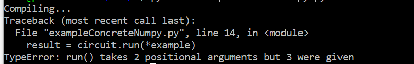 If you are using latest version of concrete-numpy (0.5.0), then you should be using encrypt_run_decrypt instead of run. This has been announced as a breaking change here, and should be already updated in the docs of that same version. Please let me know if there is any example in the docs (for the latest version) that doesn’t reflect that.