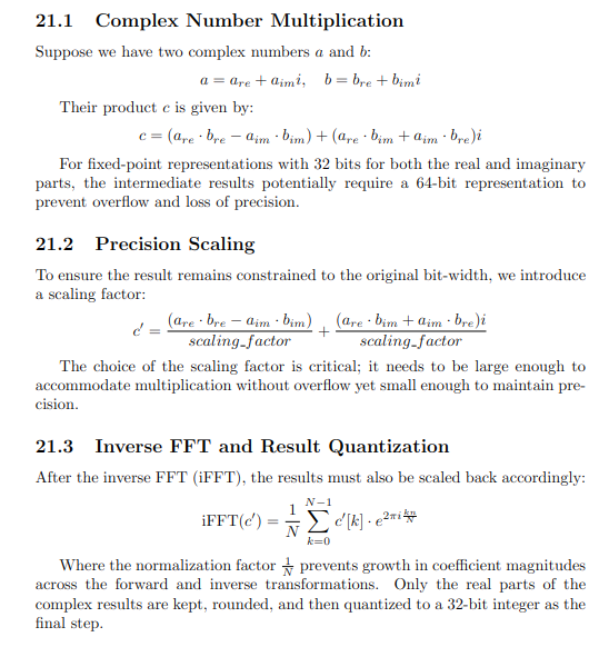 I have some problem about polynomial multiplication in TFHE. Sicen I want to try realizate the bootstrapping and there is some problems about data. The coefficients of poly are 32 bits, and the answer of FFT is complex number(fixed point)(32 bits im and 32 bits re). Then I try to multiple two complex numbers. but I find I can not understand how to assure the data after mult is still 32 bits, I must have a complex number(64 bits im and 64 bits re) to store data, then when I do ifft, the coefficients of poly become 64 bits?