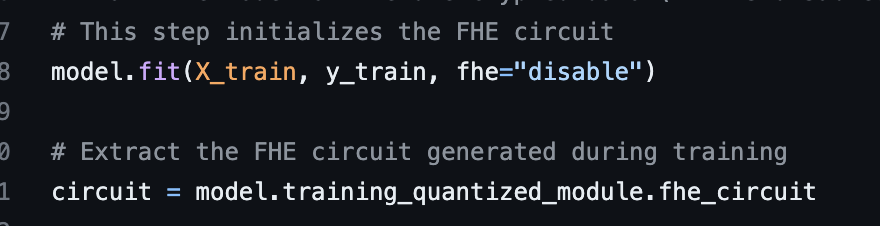 Actually, my goal is that i need to train the model using the encrypted data itself (As i don’t have the data in plaintext form i might get access to the metadata (column names, no of rows, types etc) of the data). But in this example it is using plaintext data for training and generating fhe_circuit .