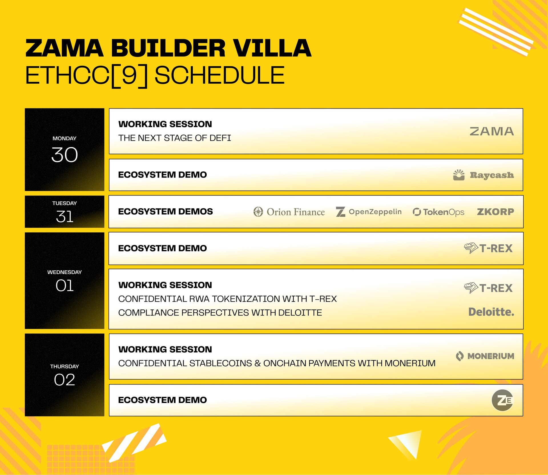 This week during EthCC[9], we’re opening the Zama Builder Villa for a week of building, brainstorming, working sessions, presentations, meetings, and networking around blockchain privacy. Featuring Deloitte, Monerium, Orion Finance, Open Zeppelin, Raycash, and TokenOps.
